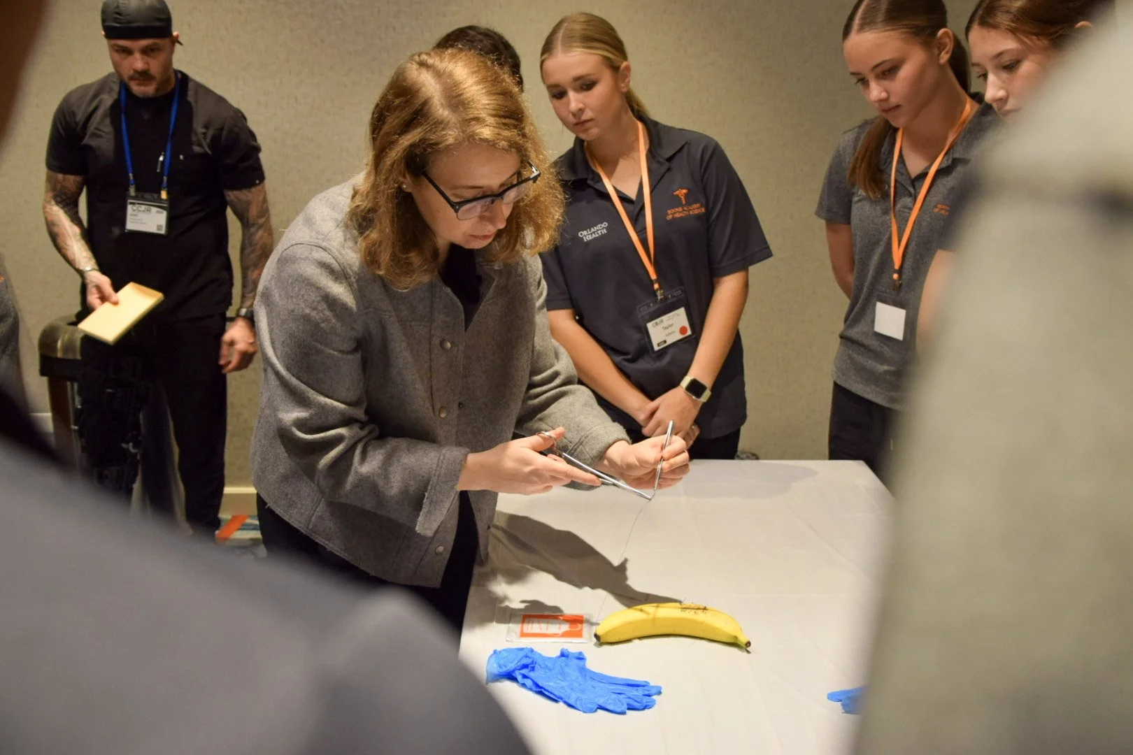 Practicing suturing on bananas with Dr. Cohen-Rosenblum.